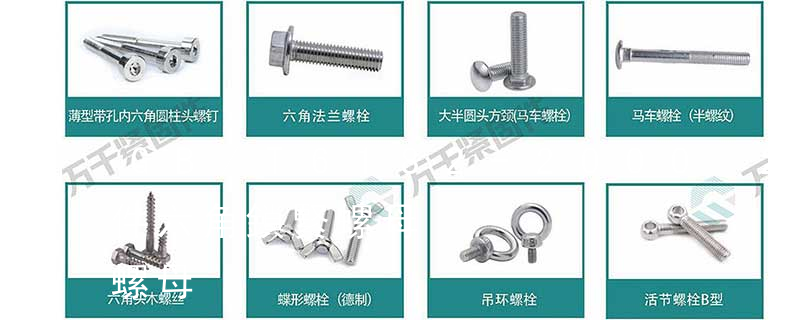 螺栓 一般常用的有六角頭螺栓、圓柱頭內六角螺栓、方頭螺栓、T型螺栓、活節螺栓、地腳螺栓。最常見的是六角頭螺栓 國標GB5783 GB5782 德標Din933 Din931 (8.8級粗牙外六角螺栓)圓柱頭內六角螺釘 國標GB70.1 1型六角開槽螺母-A和B級GB 6178-86 1型六角開槽螺母-C級GB 6179-86 2型六角開槽螺母-A和B級GB 6180-86 六角開槽薄螺母-A和B級GB 6181-86 2型非金屬嵌件六角鎖緊螺母GB /T 6182-2000 非金屬嵌件六角法蘭面鎖緊
