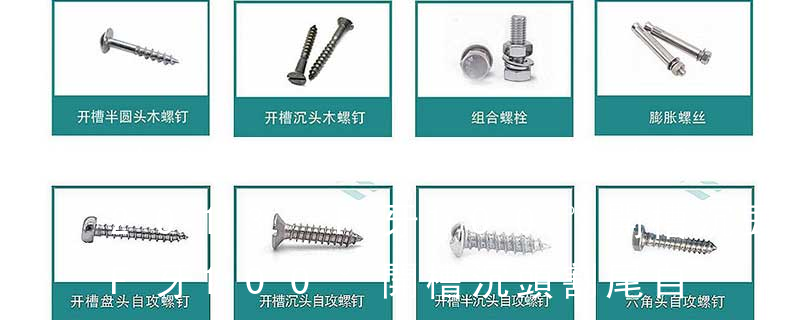 (鐵板牙自攻螺絲) B-2: Plastic Tapping Screw. (塑膠用,自攻螺絲) C: Wooden Screw : 木工螺絲 D: Drywall Screw :水泥墻螺絲 E: Self Drilling Screws鉆尾螺絲(不銹鋼鉆尾螺絲,復合材料鉆尾螺絲) F:膨脹螺絲,四片膨脹螺絲又